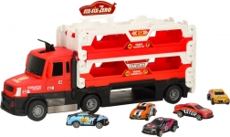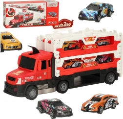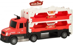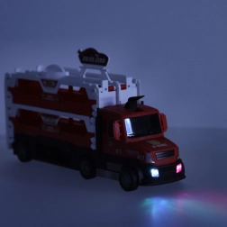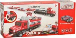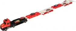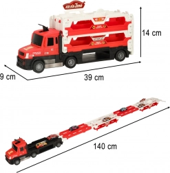 Den store røde lastbil fungerer både som biltransporter og som legesæt med en skjult racerbane. Når den foldes ud, bliver den til en lang bane, hvor de 6 medfølgende biler kan konkurrere. Den integrerede affyringsrampe giver masser af fart fra start, mens lys og lyde forstærker stemningen af rigtige løb.