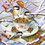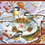 En smuk scene med fugle, sne og en kop med frø – det færdige billede egner sig perfekt til udstilling.