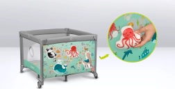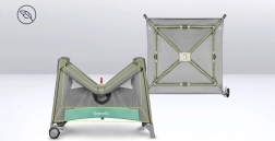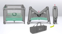 Kravlegården inkluderer en komfortabel skummadras T25 med forskelligartet 3D-overflade og LockGuard-system, der forhindrer utilsigtet foldning. For nem mobilitet har kravlegården 2 hjul med bremser og en praktisk transporttaske for nem bæring.