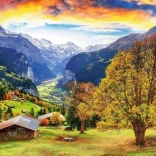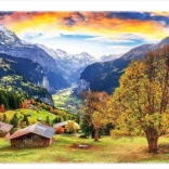 Scenen med en alpedal, træhytter, efterårstræer og snedækkede tinder imponerer med rige farver og fine detaljer – ideel til indramning efter lægning.