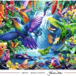 Motivet med farverige kolibrier, tropiske planter og et vandfald bringer friskhed og positiv energi ind i rummet. Perfekt som gave og til egen afslapning.