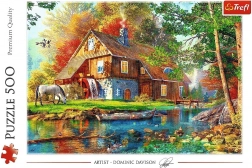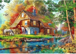 Oplev landlivets charme med et puslespil, der efter lægning danner et billede på 480 × 340 mm. Dominic Davisons illustration viser en idyllisk hytte ved en rolig bæk omgivet af natur – et ideelt motiv til stunder med afslapning og fordybelse.