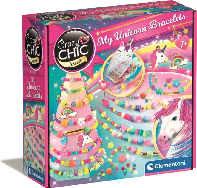 Skab dine egne magiske armbånd med det unikke sæt CLEMENTONI Crazy Chic. I pakken finder du alt, hvad du behøver for at lave trendy elastiske armbånd med vedhæng af enhjørninge og regnbuer, et stilfuldt stativ til udstilling og en æske til perler. Smykkefremstilling understøtter børns kreativitet, finmotorik og fantasi.