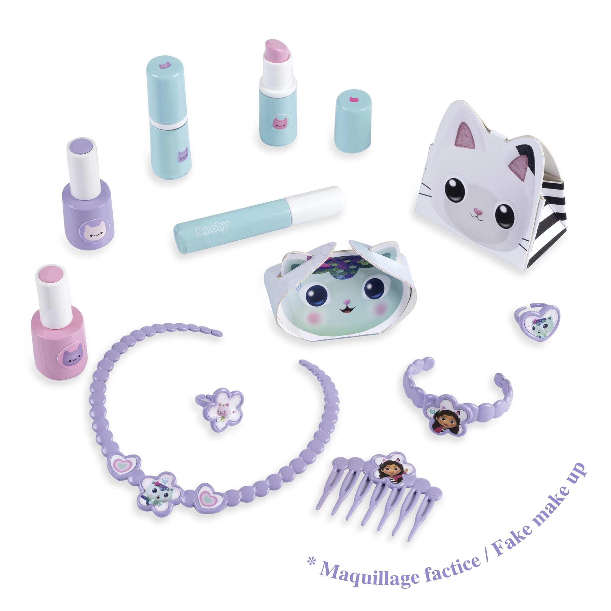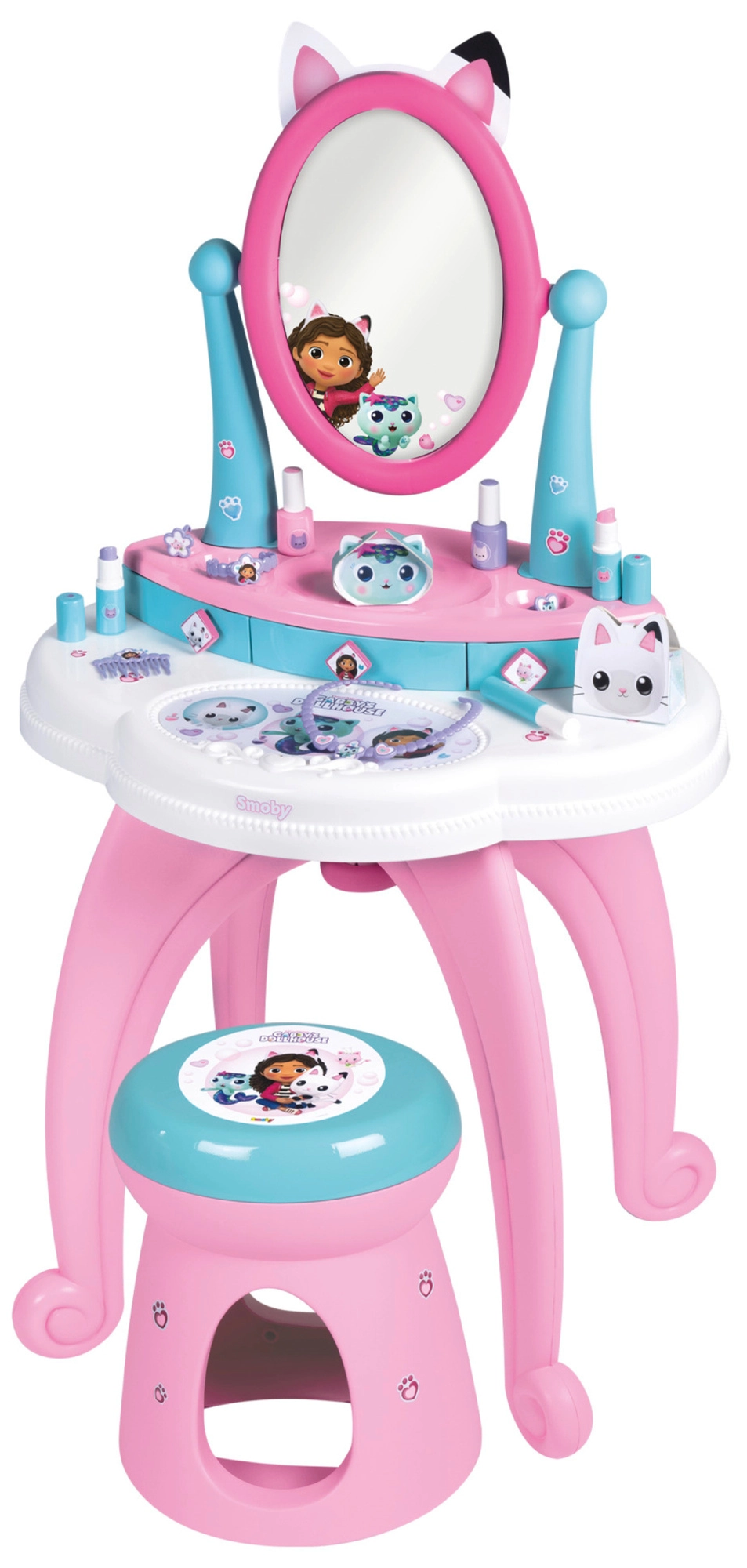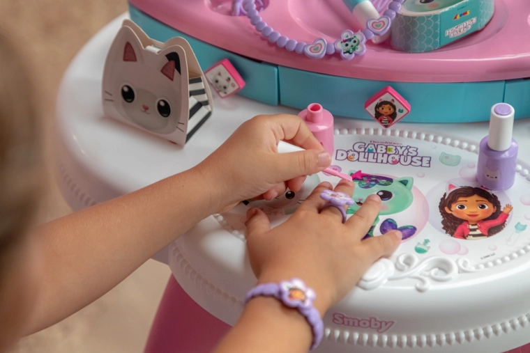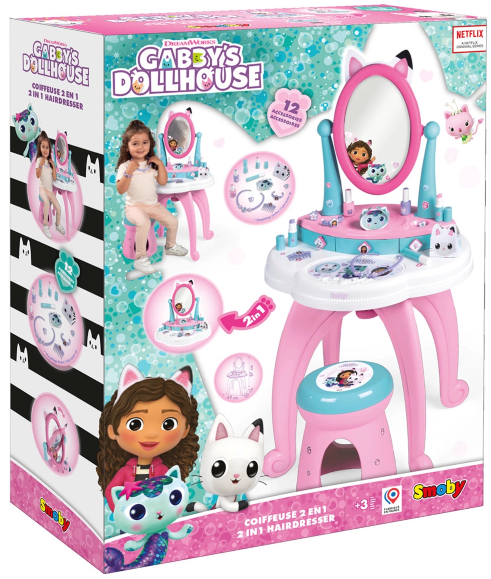 Træd ind i den magiske verden af GABBY’S DOLLHOUSE med et 3-i-1 børnesminkebord fra Smoby. Det tilbyder føntørring, makeup og neglepleje, har et stort justerbart spejl, 3 skuffer og en komfortabel skammel. Sættet indeholder 12 tilbehør til kreativ leg og udvikling af fantasi.