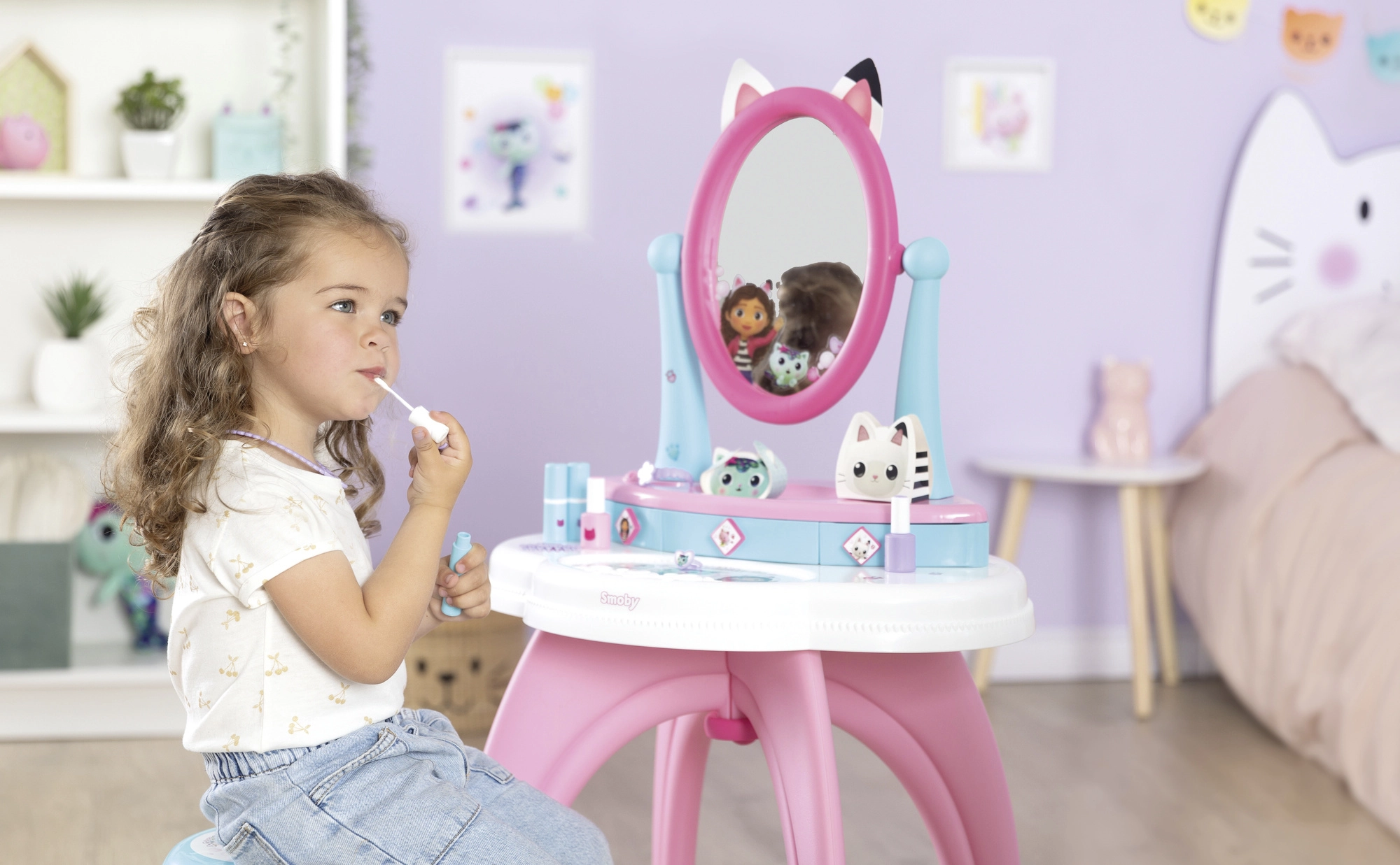 Sminkebordet til børn inspireret af den populære serie GABBY’S DOLLHOUSE forvandler værelset til et lille skønhedsstudie. Med det store justerbare spejl, tre skuffer og et rigt tilbehørssæt er alt lige ved hånden, og legen føles både realistisk og sikker.