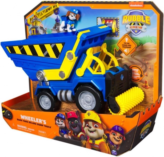 Den interaktive tiplastbil Wheeler fra den populære serie Rubble & Crew giver børn realistisk byggeleg. Når figuren placeres i kabinen og køretøjet trykkes ned, aktiveres imponerende lys- og lydeffekter som i serien. Last materialet, tip kassen og jævn terrænet med den forreste valse – helt som på en rigtig byggeplads.