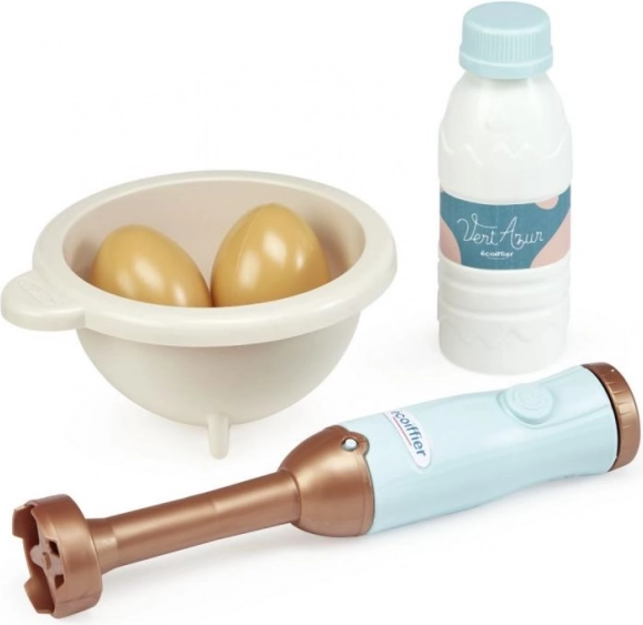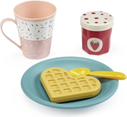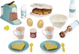 Komplet morgensæt 3-i-1 til børn med kaffemaskine, vaffeljern og stavblender, som bringer sjov og kreativ leg i legekøkkenet. Sættet indeholder mange tilbehørsdele, inklusive 4 vafler, 2 kopper, 2 æg, 2 kapsler til kaffemaskinen, skål, mælkeflaske, flødesprøjte og marmeladeglas. Ideelt til at udvikle fantasi og social leg.