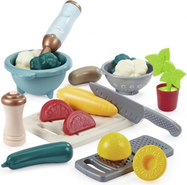 Sættet indeholder en stavblender i størrelsen 4 × 4 × 23 cm, skål, si, skærebræt, kniv, rivejern og realistiske grøntsagsmodeller. Den solide plastkvalitet og de afrundede former er tilpasset børnehænder og sikre til daglig leg.