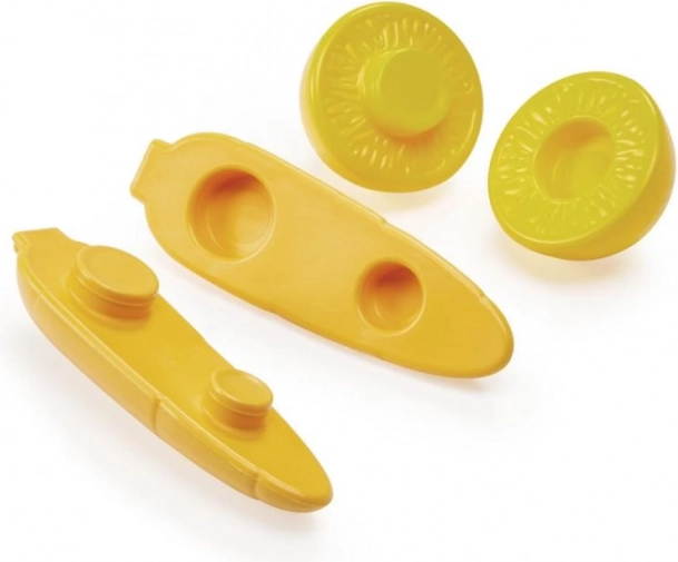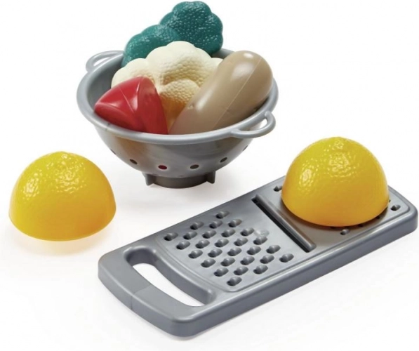 Skål, si, skærebræt, kniv, rivejern og grøntsagsmodeller lader børn skære, rive og blande som i et rigtigt køkken.