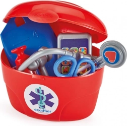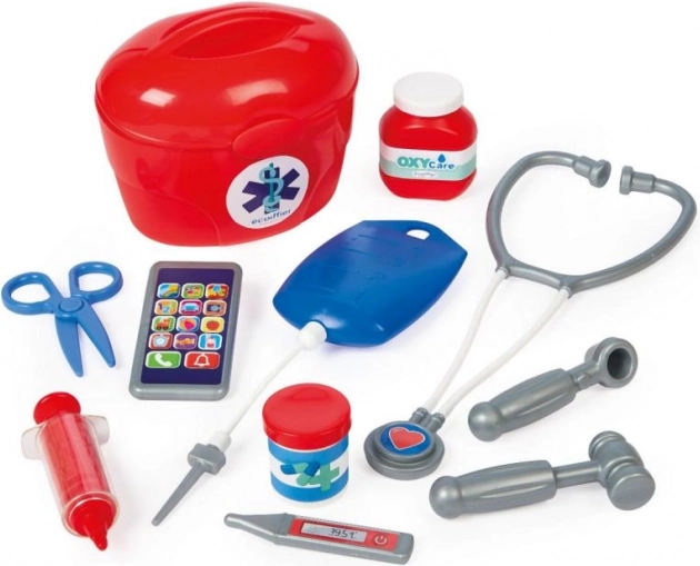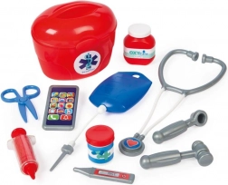 Der medfølger en rød lægekuffert, hvor børn kan lægge alle instrumenter. Alt bliver samlet og klar til næste leg.