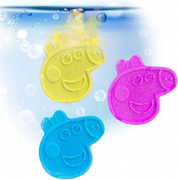 Ideel som en lille gave, belønning eller som et pift til aftenrutinen. Sættet indeholder tre mini-bomber formet som Peppas ansigt, som opløses hurtigt og gør badet til en sikker og sjov leg.