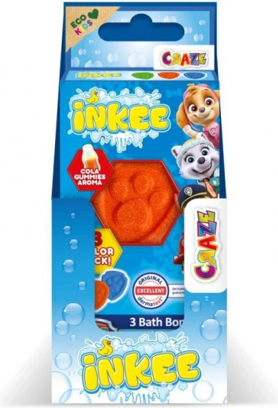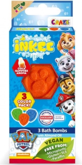 Inkee Paw Patrol badebomber forvandler badet til en farverig og velduftende leg. Hver minibombe bruser langsomt, farver vandet og frigiver en mild duft, som børn vil elske. Takket være den tilsatte mandelolie hjælper de med at gøre huden smidig og blød.