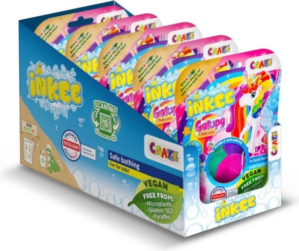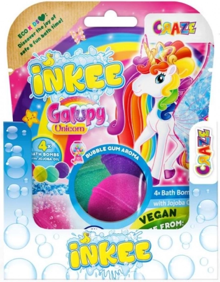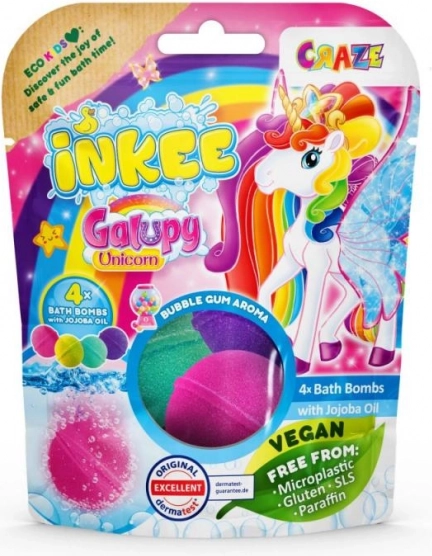 Bring glæde og farver til børnebadet med INKEE Galupy Unicorn. Hver bombe bruser blidt i vandet, frigiver sjove farver og en sød tyggegummiduft, mens jojobaolie hjælper med at holde huden blød.