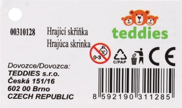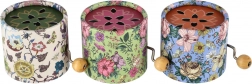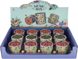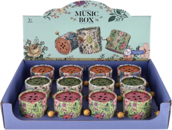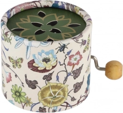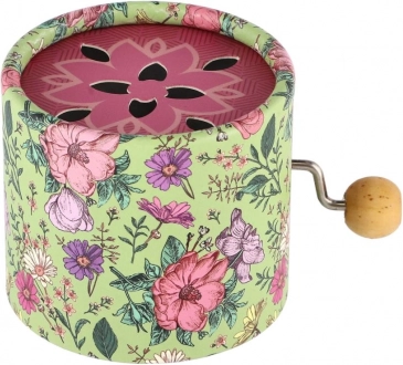 Spilledåsen fås i flere farvevarianter med dekorativt blomstermønster. Manuelt mekanisk drev kræver ingen batterier, så den er altid klar til brug. Anbefales fra 3 år.