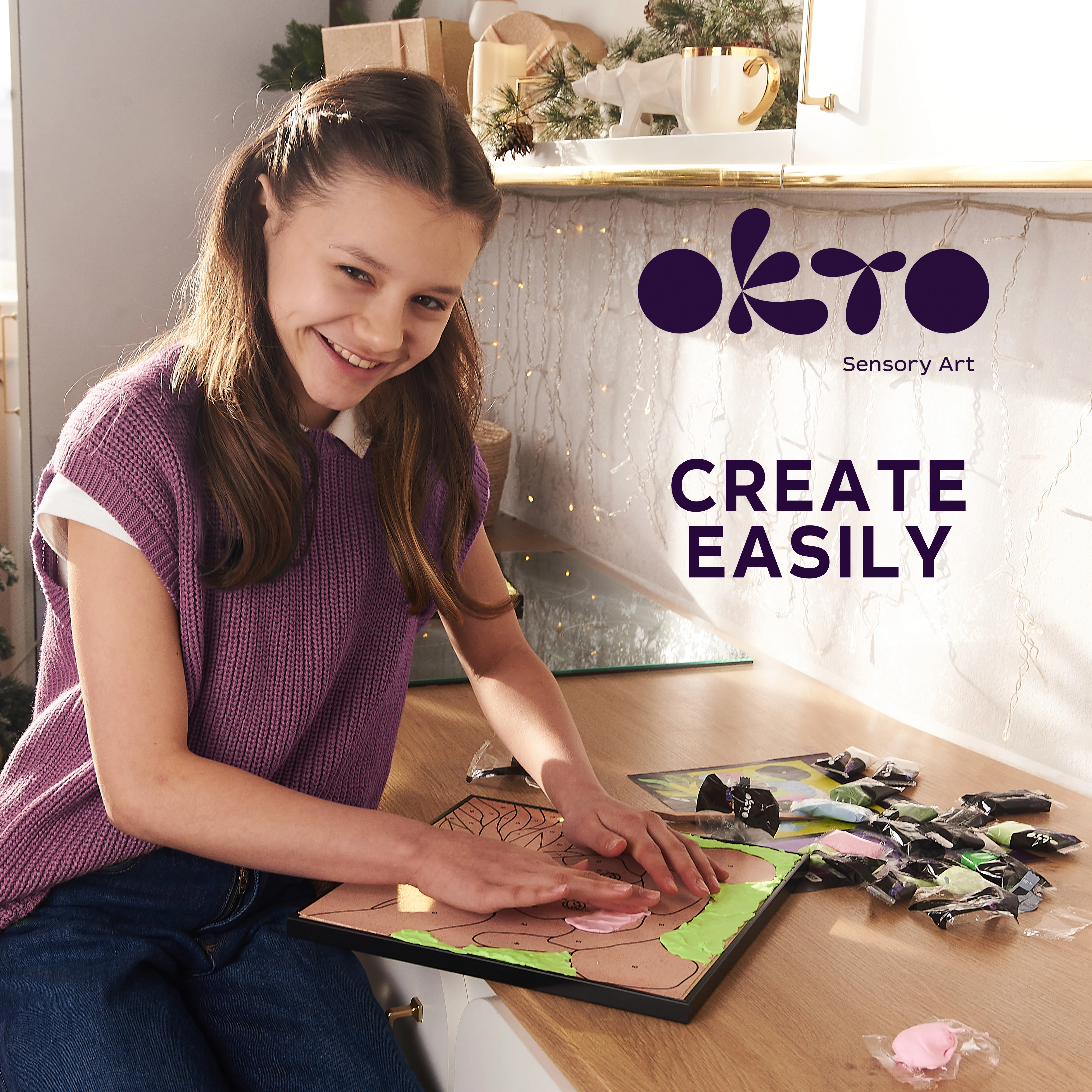 OKTO Panda kunstsæt til maling på lærred 30x30 cm. Lærredsstørrelse 30x30 cm. Naturligt lærred, vejledning, træformningsværktøj, 40 stk. modelleringsmasse.