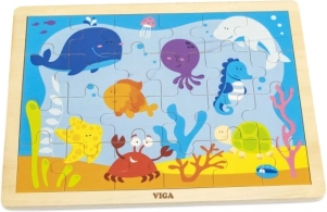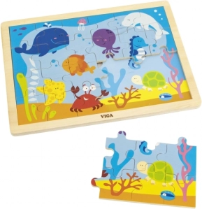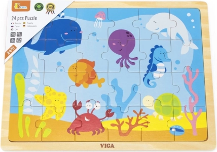 Glade træpuslespil med temaet fra undervandsverdenen udgør den ideelle underholdning for børn. Sammensætning af 24 brikker hjælper med at udvikle kognitive og motoriske færdigheder.