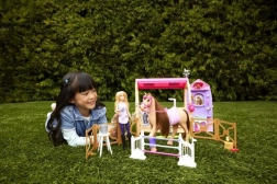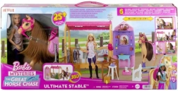 Leget en ride-dag med Barbie Ultimate Stable-sættet, som tilbyder et 360° legeunivers og masser af tilbehør til hestepleje. Børn kan hjælpe Barbie med at fodre ved stationen, rense og børste i plejezonen, træne spring over forhindringer og derefter stolt udstille rosetter på trofævæggen. Der er også en lyserød “plug and play”-have og mulighed for nemt at folde stalden sammen for enkel opbevaring.