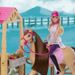 Sættet inkluderer en Barbie-dukke i rideudstyr, en hest med realistiske detaljer og lang blød man, en stald med halvtag og et rigt sæt tilbehør til fantasifuld leg. Ideelt til børn fra 3 år, der elsker heste, dyrepleje og at fortælle deres egne historier.