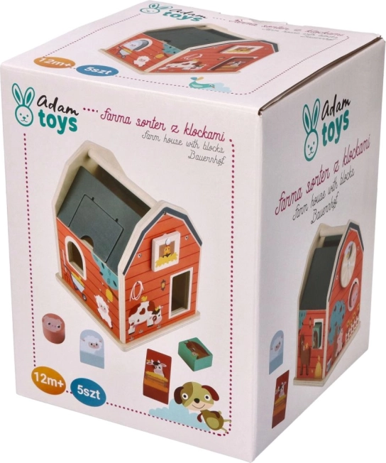 Kassen indeholder fem farverige former, der forestiller forskellige bondegårdsdyr som et får, en gris og en ko, som børnene kan placere i de tilsvarende åbninger på gårdens sider. Formerne er store nok til, at børn trygt kan bruge dem ved selvstændig leg.