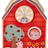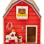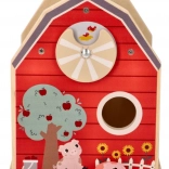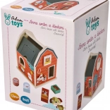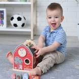 Trækassen med bondegård og former er det ideelle legetøj til små børn, der øver koordination og formgenkendelse. Gårdens konstruktion med åbnende døre og tag giver nem adgang til formklodserne og byder på endeløse muligheder for interaktiv leg. Børn kan lære at genkende forskellige former og farver, mens de træner deres finmotorik.