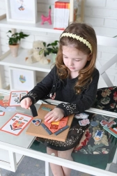 Med 76 dele, inklusive farvede geometriske former og gårdfigurer, udvikler børn finmotorik og kreativitet.
