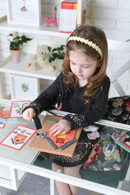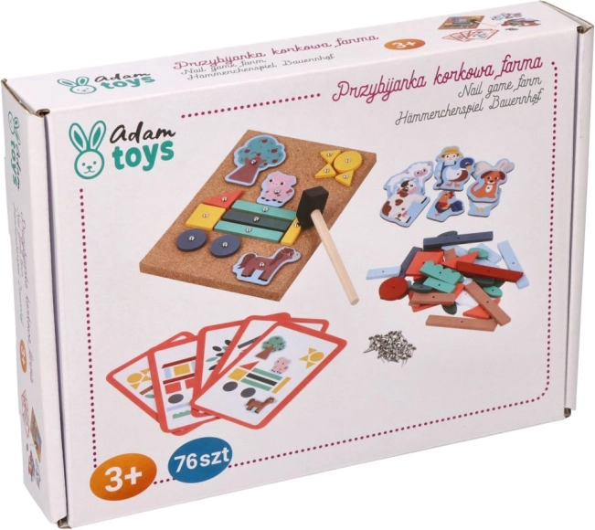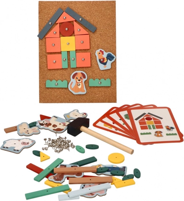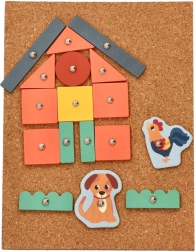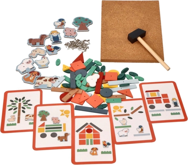 Korkbræt med søm – Eventyr på gården er en ideel måde at støtte børn i at skabe deres egne historier. Dette sæt tilbyder mange farverige træformer og figurer fra gården, som kan fastgøres til korkpladen med små søm og en hammer. Børn kan ved hjælp af instruktionskort bygge forskellige scener og derved udvikle deres rumlige færdigheder.