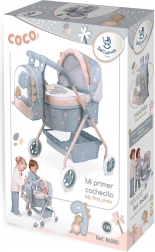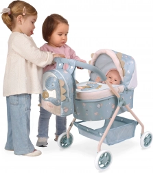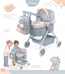 Oplev den første dukkevogn designet til de mindste børn. Takket være det lave håndtag, den lette konstruktion og den glatte styring er den let at køre både inde og ude. COCO-kollektionens design i blid gråblå med sand- og rosa accenter fuldendes af et legende motiv med dinosaurmor og unge.
