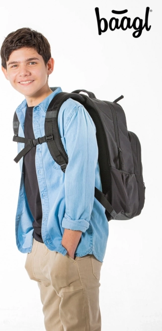 Elegant sort sæt fra mærket Baagl inkluderer en rummelig rygsæk, et praktisk penalhus og en smart pose. Alle dele er designet med fokus på maksimal komfort, sikkerhed og stil. De er kendetegnet ved stærke materialer og kvalitets lynlåse.