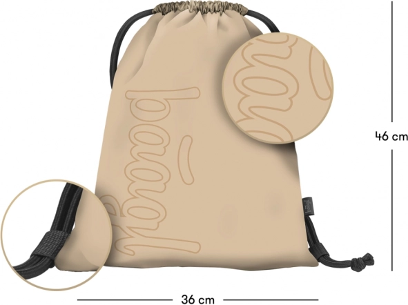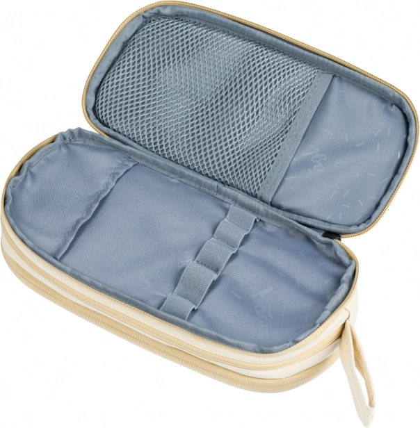 Sættet inkluderer også et stilfuldt penalhus med tre rum og en skopose lavet af et robust, vaskbart materiale, der muliggør praktisk rygbæring.
