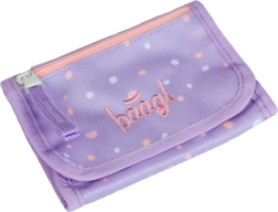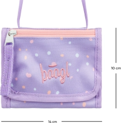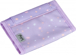 Den gennemtænkte inddeling med velcrolukning og en indvendig lynlåslomme til mønter holder kontanter, kort og nøgler overskueligt og sikkert. Det stilfulde lilla design med prikker og et diskret logo giver pungen et moderne look, der passer perfekt til både skole- og fritidsudstyr.