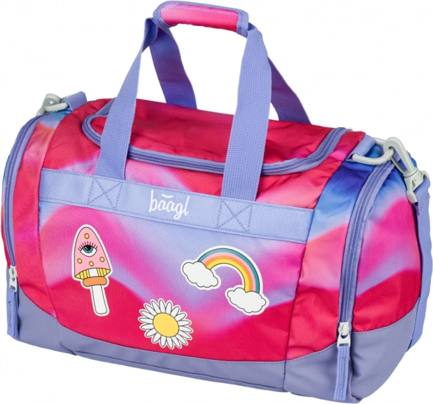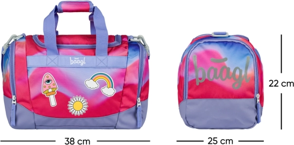 Let og stilfuld BAAGL børnesportstaske i regnbuemotiv er ideel til fritidsaktiviteter, idræt og som håndbagage. Den tilbyder en rumlig hovedlomme med bred åbning, separat skorum, aftagelig justerbar rem og forstærket vandafvisende bund. Pålidelige YKK-lynlåse sikrer glat åbning, og reflekselementer for sikkerhed mangler ikke.