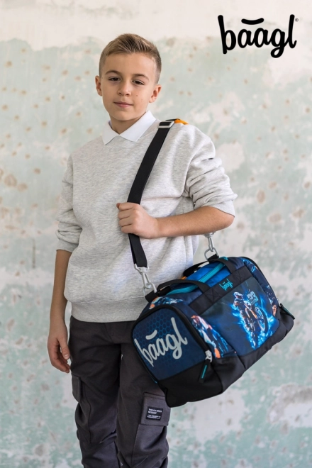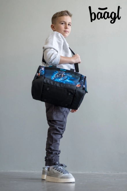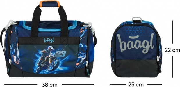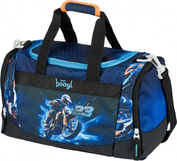 Let og praktisk sportstaske til børn fra BAAGL med motorcykelmotiv, ideel til fritidsaktiviteter, træning og som håndbagage. Den tilbyder en rumlig hovedlomme med bred lågåbning for nem pakning, en separat skot lomme, en aftagelig, justerbar skulderrem til crossbody-bæring og en forstærket vandafvisende bund. Pålidelige YKK-lynlåse sikrer smidig betjening, og reflekterende elementer øger børns sikkerhed i tusmørke.