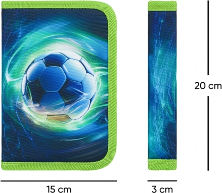 Stilfuldt og robust penalhus med fodboldmotiv – perfekt til skolebørn, der vil have deres redskaber lige ved hånden og i orden. Enkeltlagsdesign med to klapper giver smart opdeling til blyanter, tuscher og lineal.