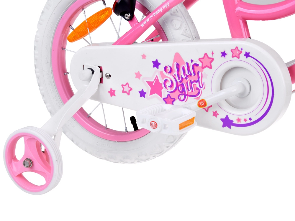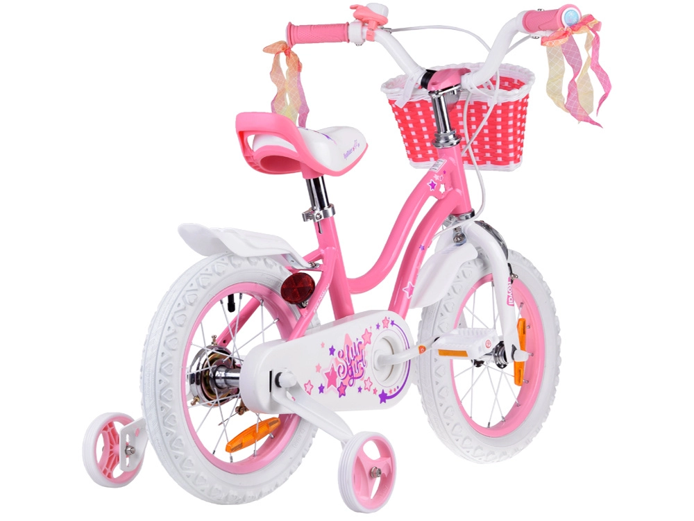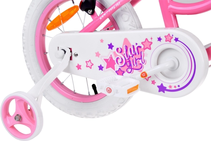 Børnecykel RoyalBaby Star Girl 14 tommer med kurv og støttehjul – Rosa