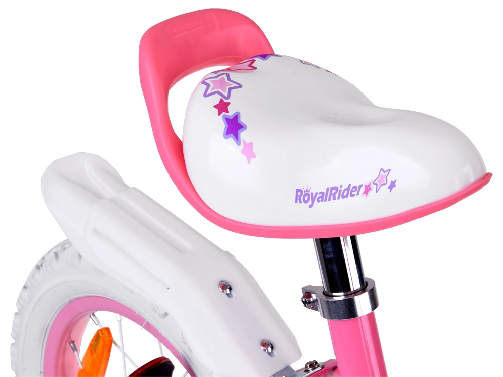 Børnecyklen RoyalBaby STAR GIRL 14" kombinerer sikkerhed, komfort og køreglæde. Stålramme, oppustelige gummidæk og kvalitetslejer giver en jævn og stabil kørsel, mens ergonomisk styr med plads til klokke, kurv og frynser begejstrer ethvert barn. Fuldt kædedæksel beskytter mod snavs og skrammer.
