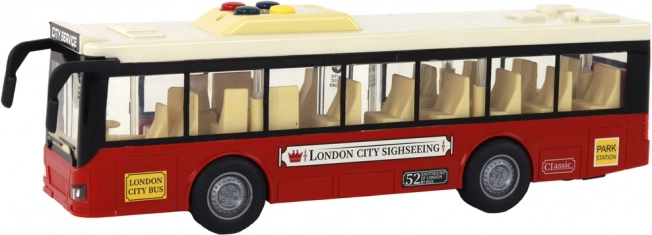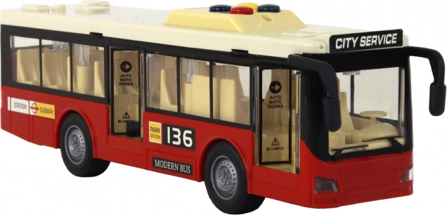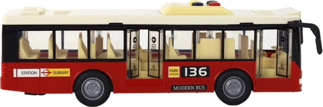 Den røde batteridrevne bybus i skala 1:16 er designet til små transportentusiaster. Denne realistiske model tilbyder mange funktioner, der løfter legen til et nyt niveau. Børn kan spændt udforske buschaufførernes verden takket være fire funktionelle knapper på taget, som aktiverer forskellige lyde.