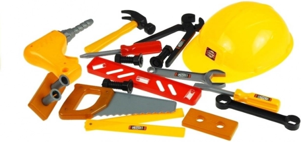Sættet indeholder en let plastikhjelm som en stilfuld detalje til små bygmestre. Den understøtter fantasifuld leg og giver børn en autentisk oplevelse under gør-det-selv-aktiviteter.