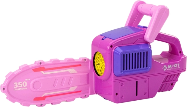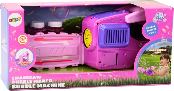 Sjov boblemaskine til børn i form af en motorsav i lyserød farve, som laver masser af magiske bobler med ét tryk. Ergonomisk håndtag for sikker og komfortabelt greb, pakken indeholder 2 flasker væske. Certificeret CE og i overensstemmelse med EN71. Strømforsyning 4× AA (medfølger ikke).