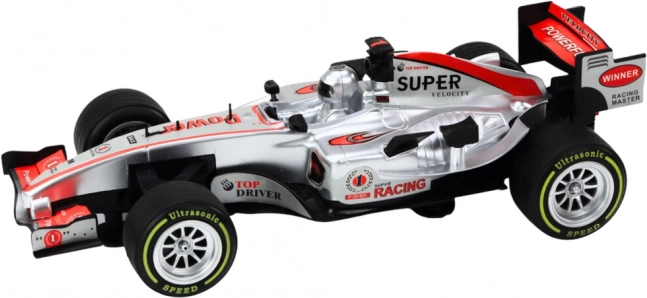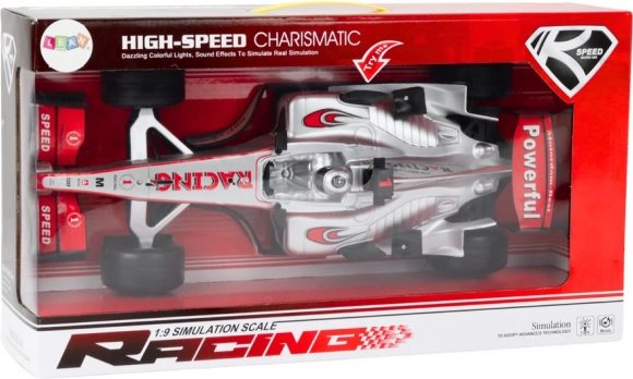 Stilfuld racerbil i sølv i målestok 1:9 vil glæde både små og store bilentusiaster. Den byder på realistisk udseende, lys- og lydeffekter samt træk‑op‑mekanisme for dynamisk kørsel. Store sorte racerdæk sikrer godt vejgreb på forskellige underlag, og sportsspoilere giver bilen et aggressivt look.