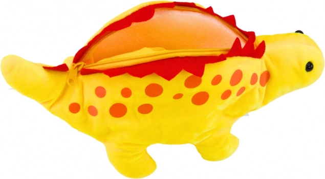 Vi præsenterer en plysdinosaur, som vil fortrylle hvert barn med sin livlige gule farve og røde detaljer. Den er lavet af et blødt materiale, der er behageligt at røre ved. Denne dinosaur er ikke bare et almindeligt legetøj – takket være lynlåsen på ryggen kan den fungere som et praktisk penalhus eller et opbevaringssted til dit barns småting. Den har også en ophængsstrop, som gør det let at fastgøre den til en rygsæk eller taske.