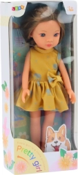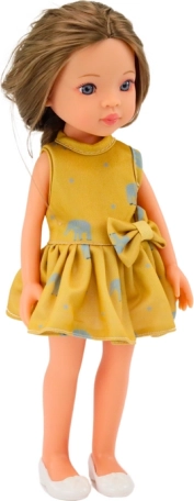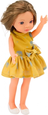 Den søde dukke på 33 cm er ideel til daglig underholdning. Hun har en fin make-up, iført gul kjole med elefantmønster og hvide sko. Elegant hårstyling opfordrer til børns kreativitet.