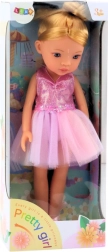 Dukken har langt, blond hår og en rosa glitrende kjole, som giver hende et realistisk balletlook.