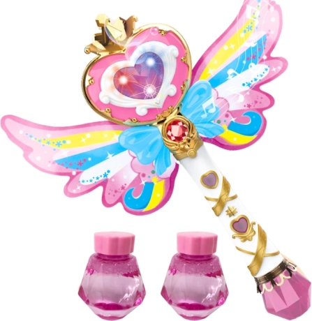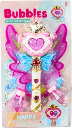 Sæbeboblemaskine formet som en tryllestav. Dens krop i bløde pastelfarver af pink, lilla og blå danner en harmonisk komposition, der straks fanger opmærksomheden. Gyldne detaljer, herunder fint udsmykkede elementer og en funklende rød krystal, giver den en særlig glans og elegance.