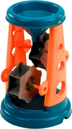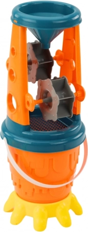 .Det farverige sandsæt med mølle er et komplet tilbehør til små strandspillere eller sandlege-entusiaster. Sættets hoveddel er en spand med mølle, som på den ene side har en praktisk si til at sigte sand og på den anden side en tragt, der gør det nemt at dosere sand præcist i konstruktionen. Takket være denne praktiske løsning bliver legen mere effektiv og kreativ.