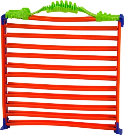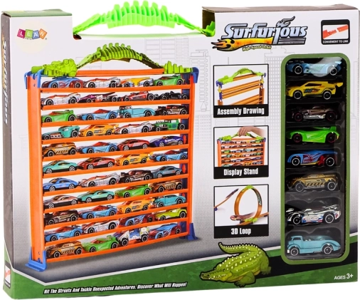 Alsidigt sæt til små bilfans: af én opbygning kan du skabe både en racerbane med 360° loop og et fleretagers garageanlæg. Let at samle, stabilt bærehåndtag og 8 forskellige små biler for øjeblikkelig leg. Det farverige design i orange, grøn og blå tiltrækker opmærksomhed og stimulerer kreativ leg.