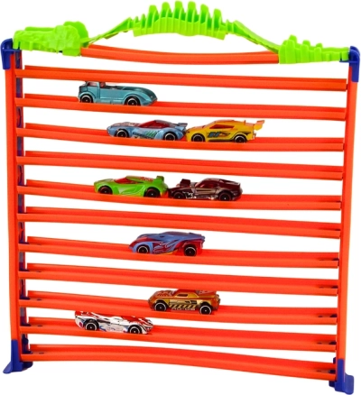 Dette smarte 2-i-1 sæt kombinerer hurtig raceraction og praktisk parkering. Byg en bane med 360° loop til dynamiske løb, og omdan den derefter nemt til en imponerende garage med 11 etager til opbevaring af hele bilsamlingen. Takket være simple samlinger kan børnene selv samle banen, og de grønne elementer danner efter samling et solidt bærehåndtag for nem transport.