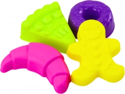 Fire farvestrålende forme i former som donut, småkage og croissant forvandler sandkassen til et fantasifuldt bageri.