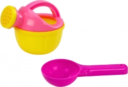 Den farverige vandkande gør det nemt at fugte sandet, og den kompakte skovl ligger godt i barnets hånd til at grave og flytte rundt.