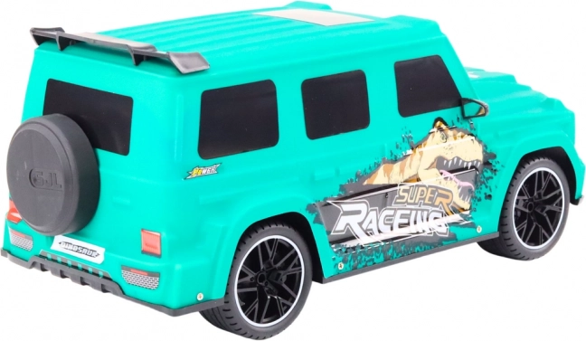 Den iøjnefaldende turkisgrønne karrosse med dinosaurgrafik og sportslige linjer sikrer, at bilen ikke overses på banen.