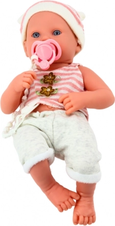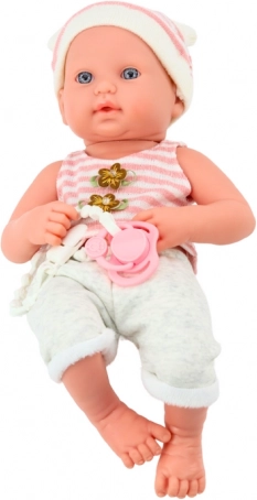 Fine ansigtstræk og et hvid‑rosa sæt med hue skaber et troværdigt udseende af en rigtig baby, som børn vil elske.